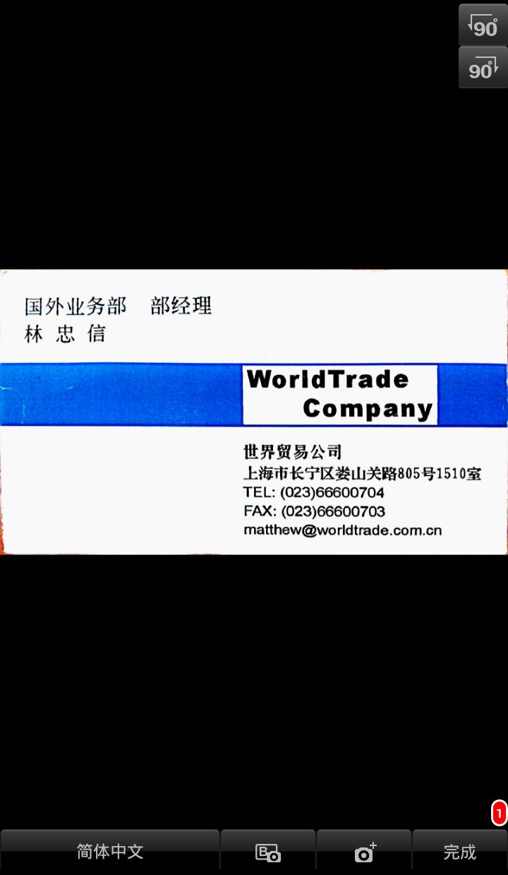 6. 点击[完成]开始辨识名片。若要拍摄此张名片的背面,请点击
