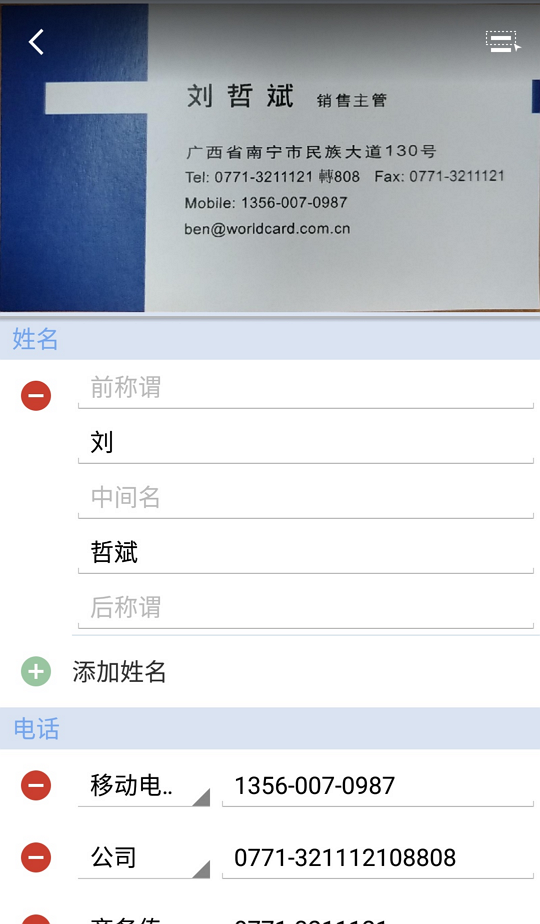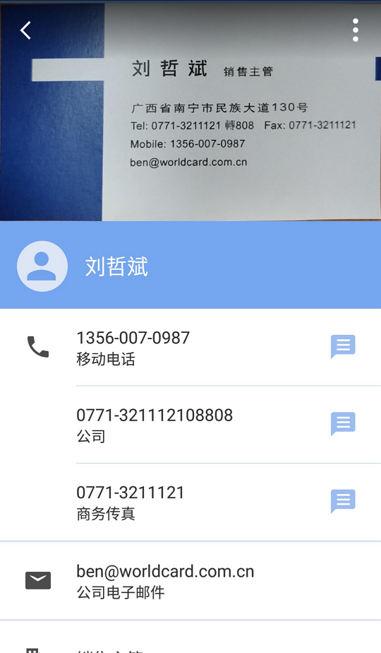 如联系人数据有正反名片图,可点击位于联系人名片图下的