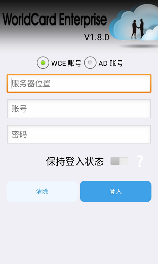 于登入画面,请选择要用[WCE账号]还是[AD账号]登入;如开启[保持登入状态],则下次开启蒙恬名片云企业版app时即会自动登入。