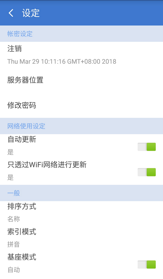 1. 网络使用设置:若启用[自动更新],系统将会自动把[我的最爱]中有异动的信息至[公有名片];取消勾选,则需要以手动更新信息。而勾选[只透过WiFi网络进行更新],则在有WiFi联机时,才能登入账号和进行数据更新。