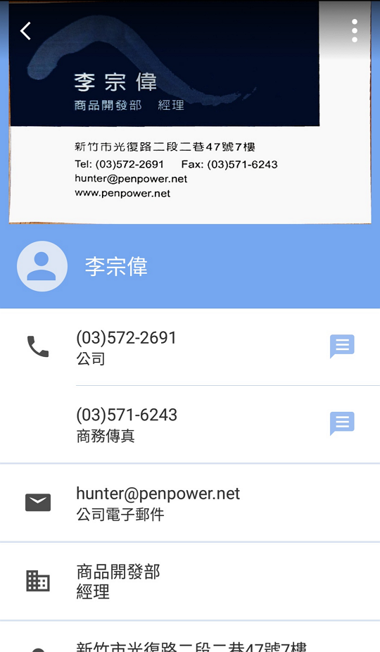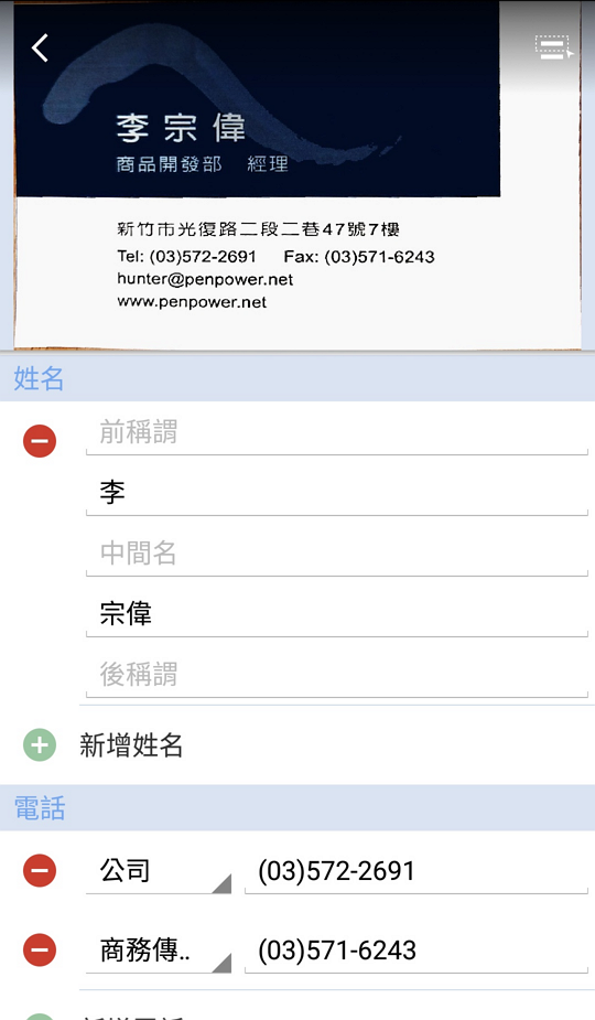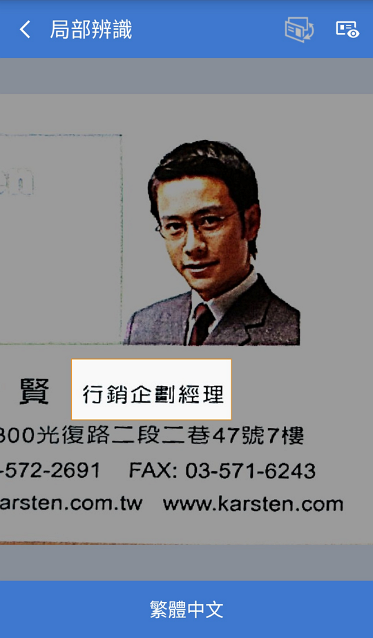 來進行辨識。如果您需要拍攝此張名片的背面,請點選