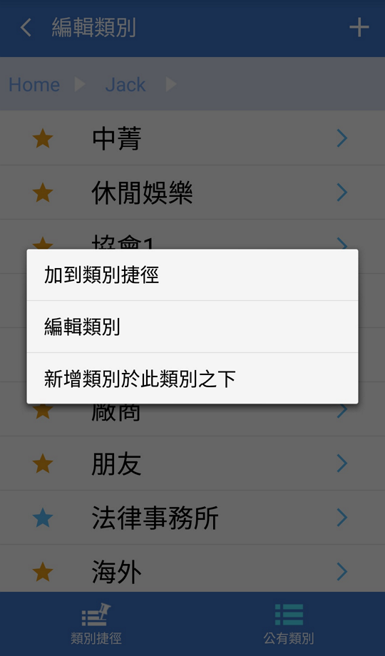 您可以於﹝公有名片﹞中將﹝公有類別﹞中的類別加入到﹝類別捷徑﹞,即可在公有名片區快速檢視聯絡人資訊。
