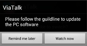 ViaTalkアプリを起動した時、更新ウィンドウが表示します。「後で確認」を選択するとスマートフォンの設定を終了します。「今すぐ見る」をクリックして、ガイドラインに従ってViaTalkの更新します。