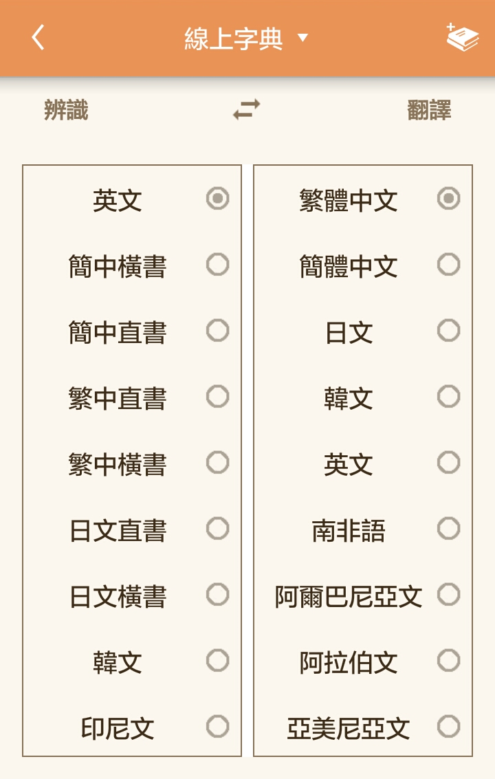 3) 因為繁體中文、簡體中文和日文能夠以直書和橫書的不同方式來書寫,所以,Worldictionary 在語言選單的原文語言中,也提供直書和橫書的繁體中文、簡體中文和日文的選項。