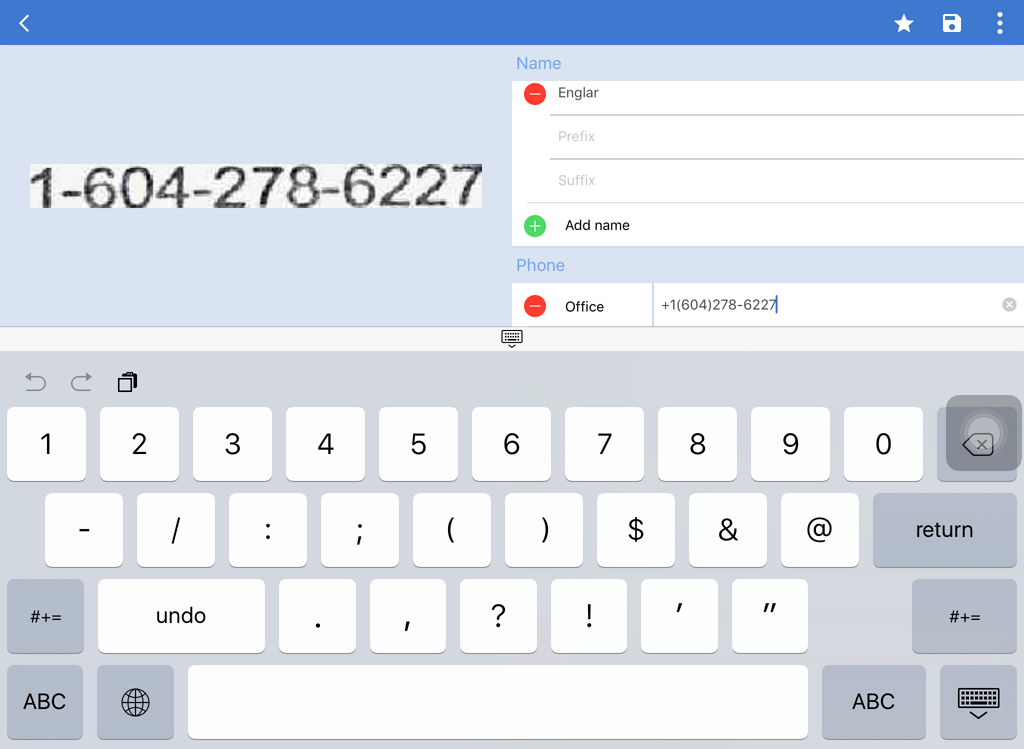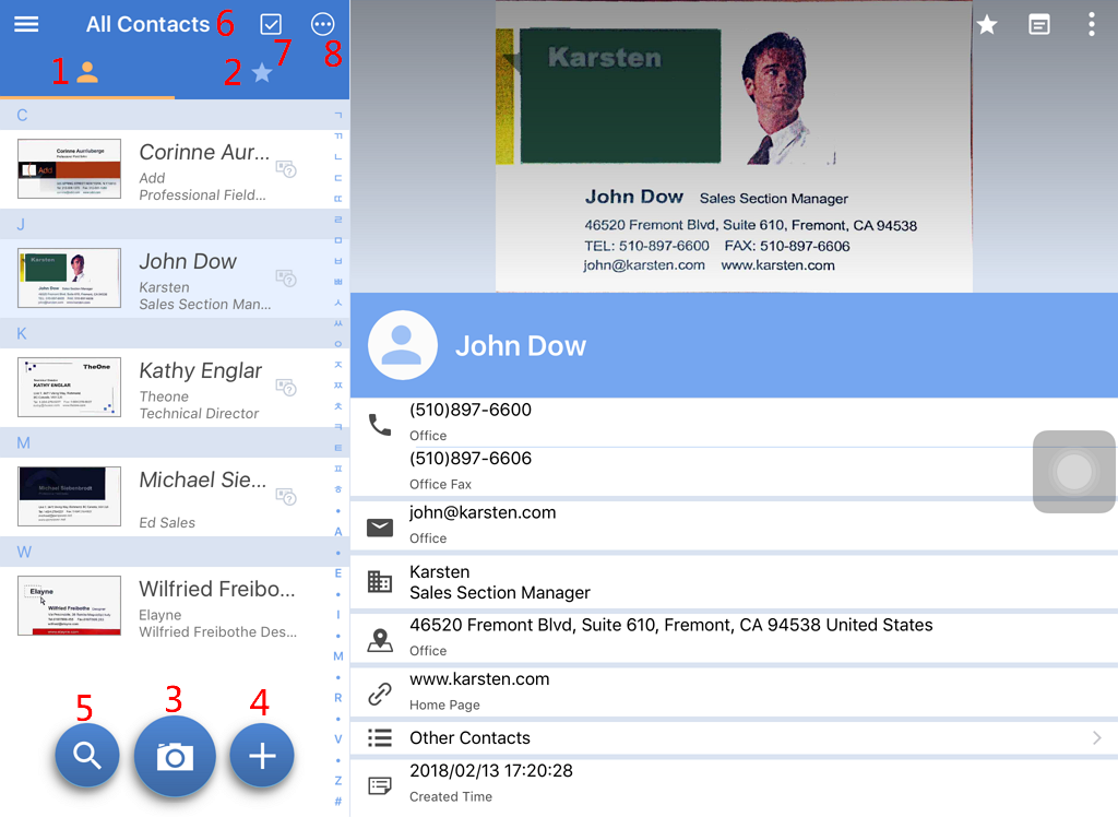Note: After adding new contacts, you can still add/change the contact's card image and partial the information on the card image to recognize, and also add notes for the contact. Please refer to the next chapter for more details.