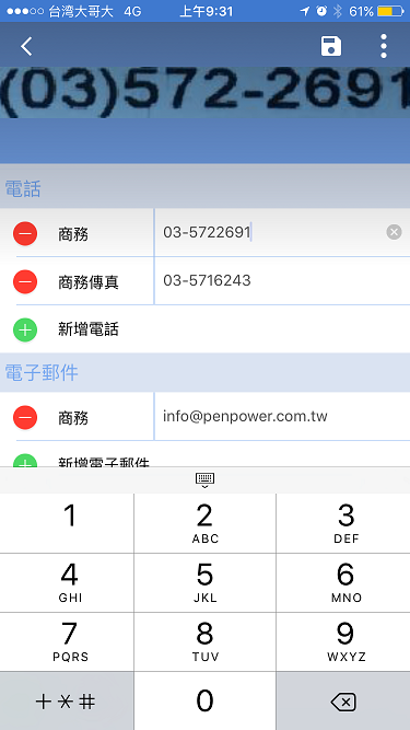 當您點選要編輯的欄位後,上方會出現該欄位資訊的原始圖像供您核對,請注意此圖像核對功能只對從這支行動裝置拍照的聯絡人有效,如聯絡人是從別處匯入的則沒有此關聯效果。