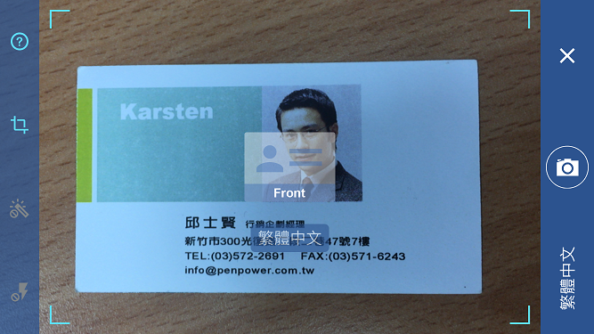 選項,請先選擇好要使用的語系,然後根據名片的直橫來拿持手機並對準名片,讓整張名片完整出現在螢幕中,並盡量在避開陰影的情況下在名片正上方拍照,以避免名片變形,接著按下相機圖示