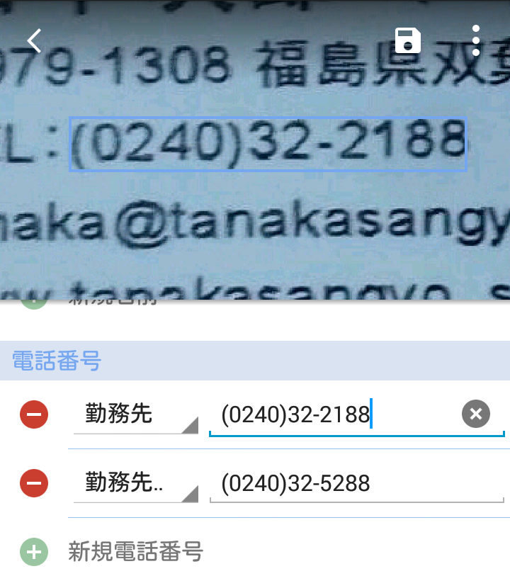 編集したいフィールドをクリックした、上方に該当フィールドのオリジナル画像を表示され、照合できます。この機能はこのモバイルフォンが撮影した名刺のみに適用します。インポートされたデータは適用しません。