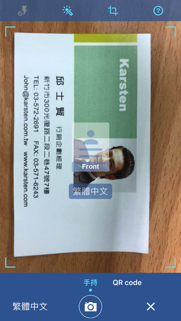 選項,請先選擇好要使用的語系,然後根據名片的直橫來拿持手機並對準名片,讓整張名片完整出現在螢幕中,並盡量在避開陰影的情況下在名片正上方拍照,以避免名片變形,接著按下相機圖示