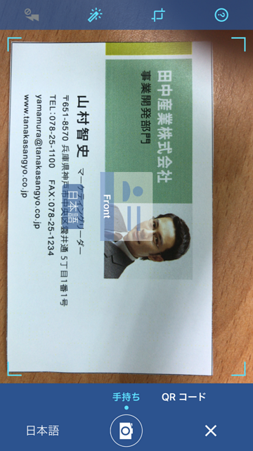 カメラアイコンの隣に[言語]をタップして、使用したい言語を設定します。名刺の方向に合わせて、名刺全体はスクリーンに表示します。できるだけ光線の反射を避け、陰に隠れないように、上面から撮影し、画像の変形を避けます。