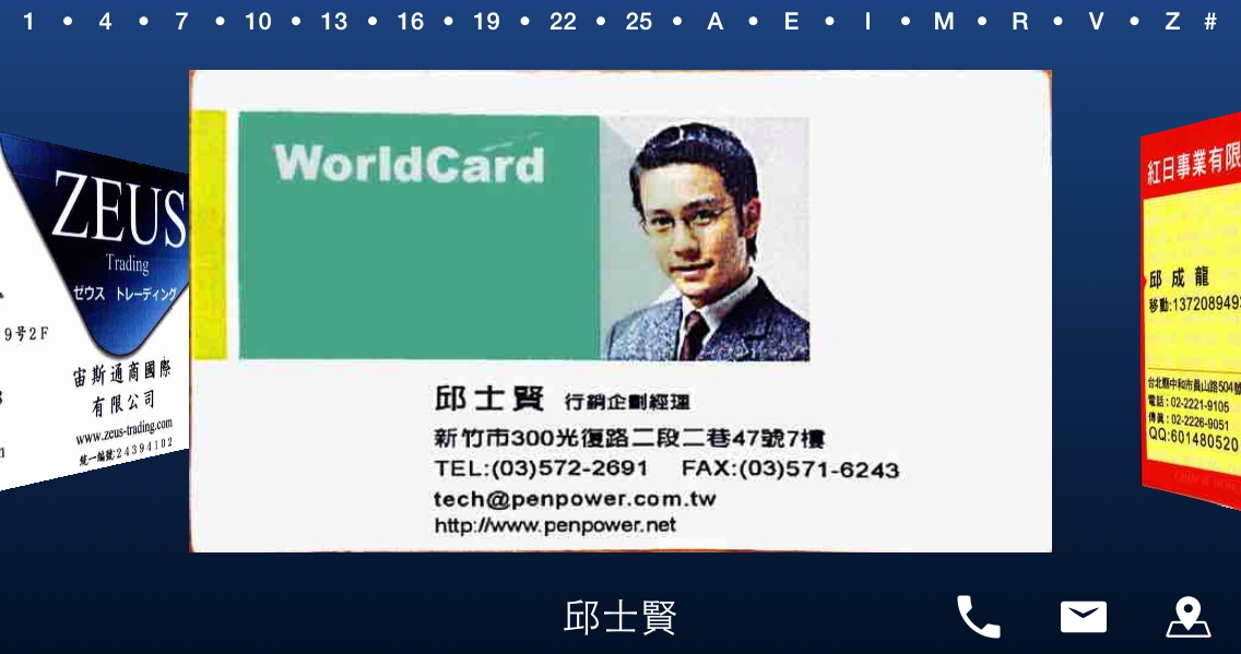 Flow模式],您可左右滑動名片圖或利用上方索引列來切換檢視聯絡人,而右下方有