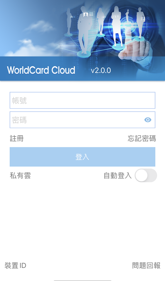 請打開蒙恬名片王雲端版(以下稱呼為WorldCard Cloud)的APP,輸入您的帳號及密碼,即可登入。
