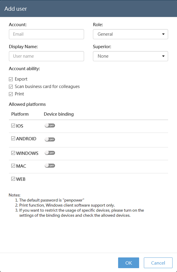 Please enter the information in the above fields and check the ability to allow the user to use, such as printing or scanning for colleagues, then click [OK] to complete.