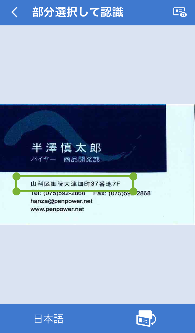 を選択して部分認識を行います。指2本で名刺画像のズームを調節後、緑のフレームを移動と拡大・縮小しながら認識したい部分を選択します。