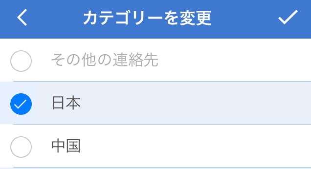 連絡先の詳細画面の最後の方に [カテゴリー] 項目があり、タップするとカテゴリーを変更できます。詳しくは次の章 [連絡先のカテゴリー管理] をご参照ください。
