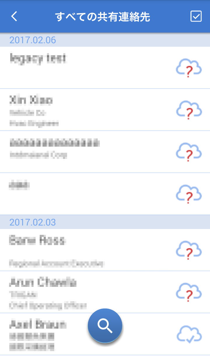 連絡先の編集、共有、カテゴリー設定、ダウンロードなどを行った時は、必ず WorldCard Cloud サーバーと同期をして、変更内容を反映させてください。