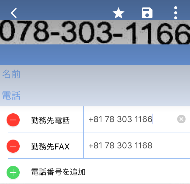 フィールドをタップすると、上部に該当フィールドのオリジナル画像が表示され、照合できます。 この機能はこのスマートフォンで撮影した連絡先のみで機能し、インポートされたデータでは表示されません。