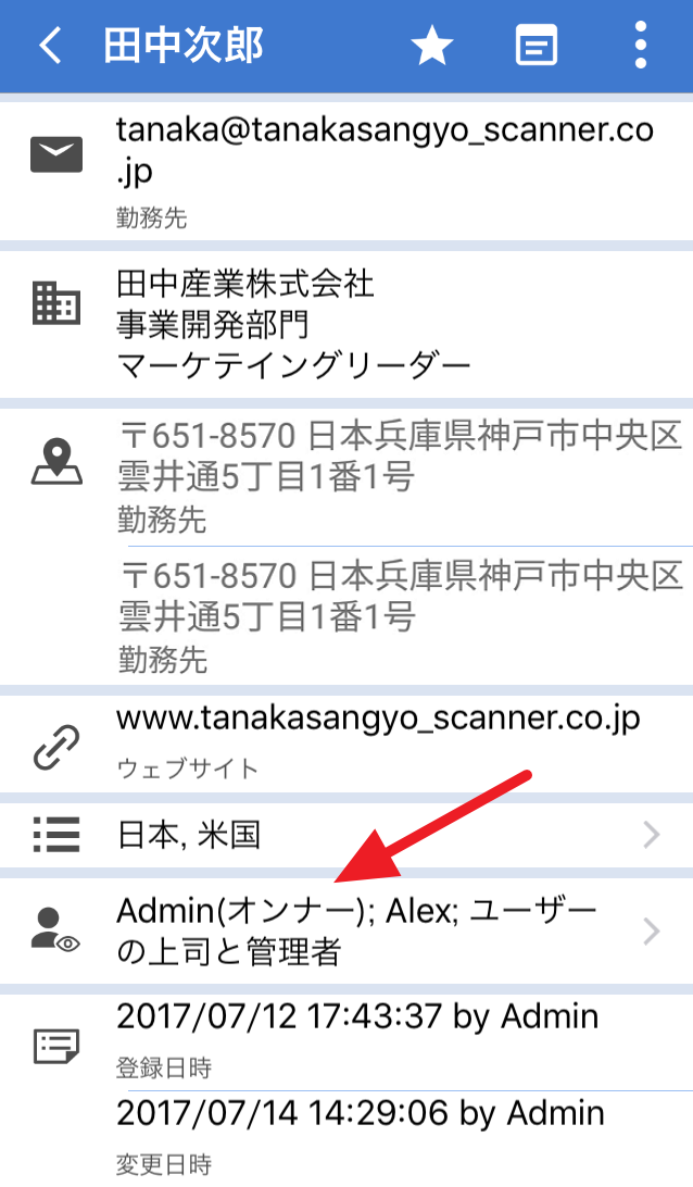または連絡先の詳細画面で、[アクセス可能のユーザー] をタップし、共有相手を設定します(下図)。